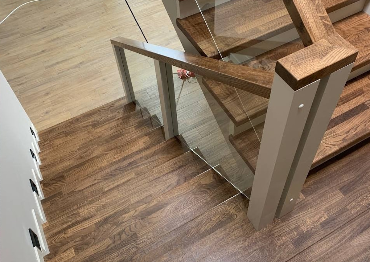 Лестница на второй этаж со стеклянными перилами